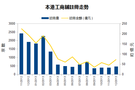 美聯工商舖行政總裁黃漢成指出,2013年工商舖物業總註冊量錄得9,829宗成交,涉資約1,020億元,按年分別下跌46%及42%。近月,工商舖按月註冊量漸漸回升,而且部分資深投資者亦開始物色有潛力的盤源。