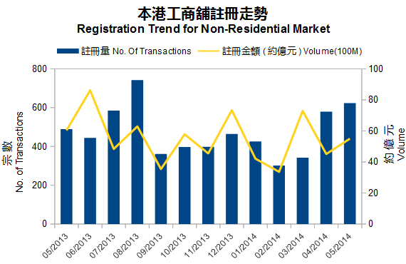 5月份工商舖市場受各項利好因素帶動,交投創自去年8月以來九個月新高。根據美聯工商舖資料研究部綜合土地註冊處資料顯示,上月工商舖總註冊量錄得623宗,涉資約55億元,按月分別上升約7.6%及21.9%,價量齊升,反映市場氣氛向好。