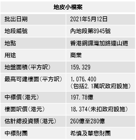 地政總署剛公布,銅鑼灣加路連山道商業地王由希慎及華懋財團以197.78億港元投得,樓面呎價約18,374元(尚未扣除需興建的3座政府設施)。