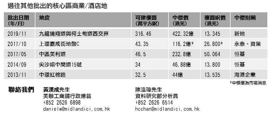 這幅銅鑼灣地王被視作下月中環新海濱商業地王的前哨戰,鑑於今次的賣地結果優於市場預期,本行預計下月中環地王流標機會較低,甚至作價或再有驚喜。