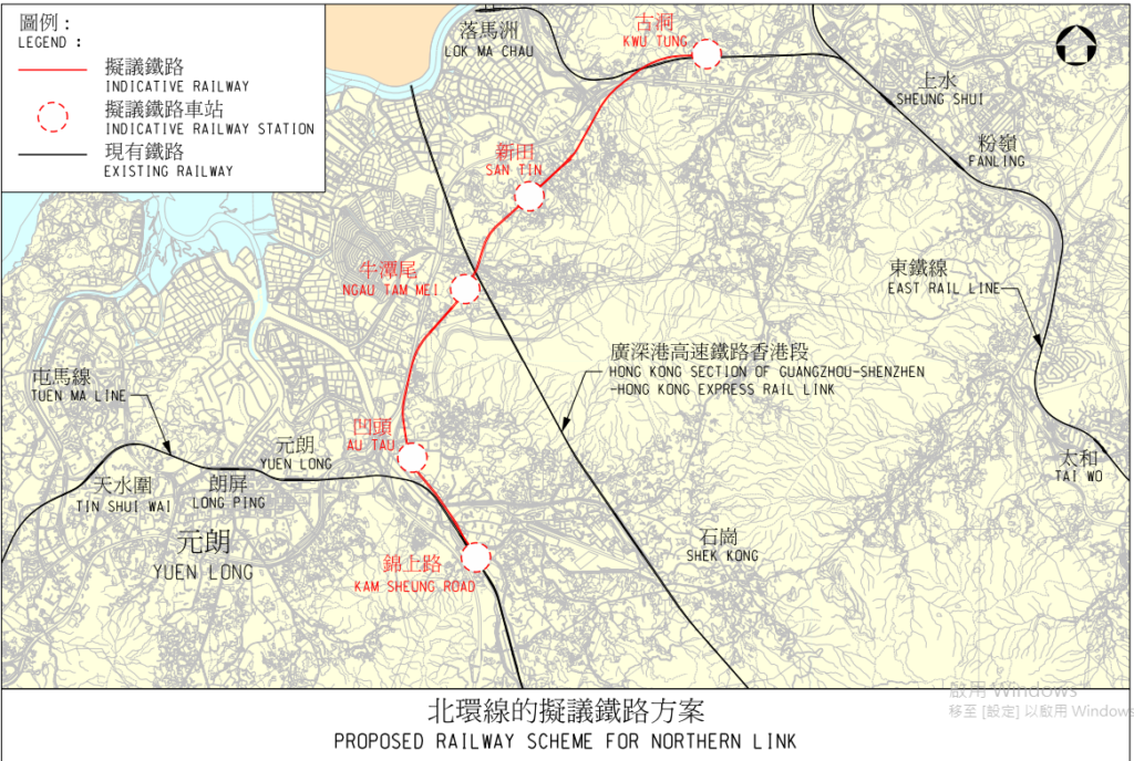 為促進新界東西間的來往及古洞北新市鎮的發展,政府將會興建北環綫,工程將分為兩期進行。第一期工程為古洞站的興建項目,車站將會設立在落馬洲支綫之間,項目已於今年9月動工,預料可在2027年竣工,車站的造價為59億元,連同北環綫主綫規劃、設計及前期工程等開支,工程的總造價為98億元。
