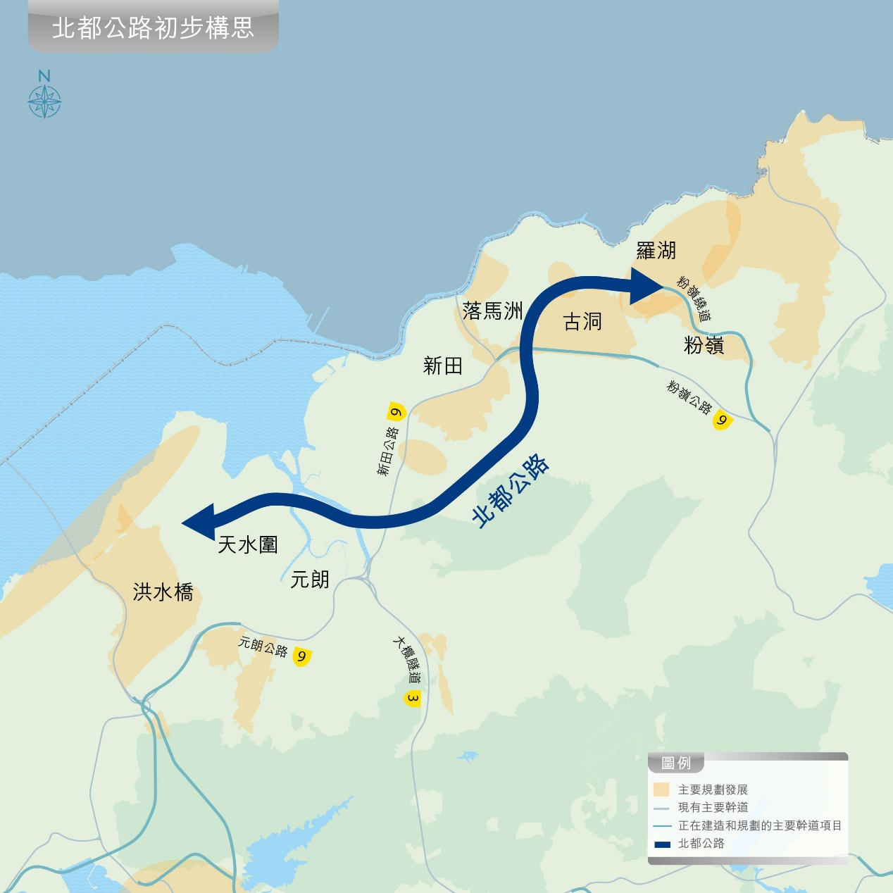為發展北部都會區,政府將會在區內興建主要幹道北都公路以促進該區的人員流動。公路將長約18公里,並由天水圍出發,途徑新田、落馬洲、古洞北及羅湖南等地,最終接駁未來的粉嶺繞道。項目將會興建隧道以穿越中途的濕地、魚塘及山嶺,而其他路段則會以橋樑貫通。
