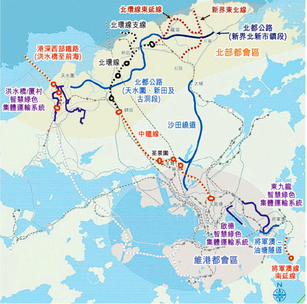 早於2022年的施政報告中,政府推出「三鐵三路」的計劃,即會在未來興建三條鐵路及三條主要幹道包括有: