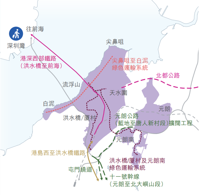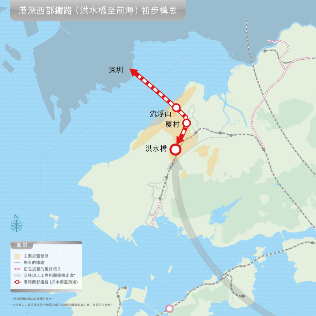 香港段的走綫長約8公里,鐵路計劃由洪水橋出發連接厦村及流浮山等地,項目將會連接未來的洪水橋/厦村新發展區。此外,為連接深港兩地,鐵路未來將會計劃向南北兩面延伸。在北延綫路中,鐵路會跨越后海灣,連接深圳的前海及內地的鐵路系統,而向南則會連接屯門東、港鐵欣澳站、未來的交椅洲人工島以及港島西等地,預料南延綫路將會長達30多公里。