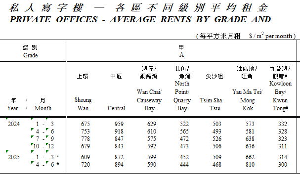 2024-25年香港各區丙廈平均租金