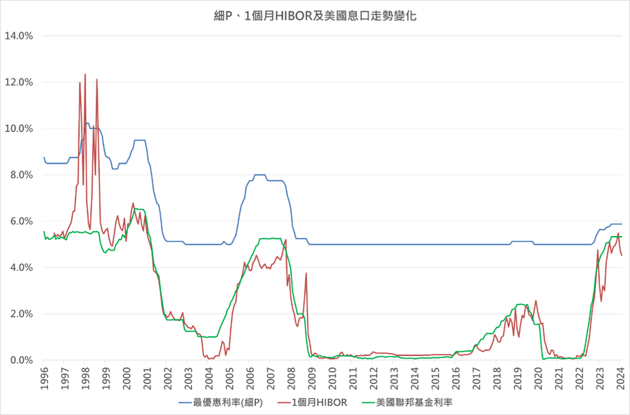 此外,銀行為賺取息差收入,細P一般都會設在較美國聯邦基金利率及HIBOR為高的水平。在2008年環球金融海嘯後,本港亦長期處於接近零息的低息環境,但細P則長期維持在5厘的水平。因此,假如按揭申請人選擇P按計劃,在貨幣政策處於寬鬆的環境下,申請人未能享受低息環境所帶來的好處,P按的利息成本會較其他計劃為高。
