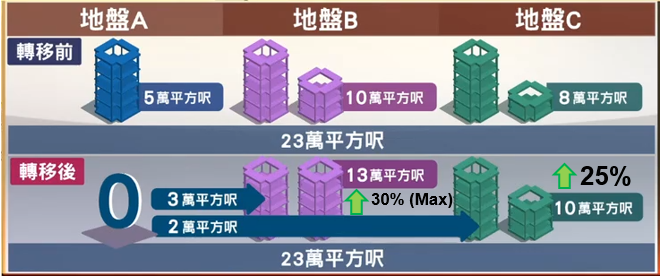 透過地積比率轉移機制將「送出地盤」的建築樓面面積轉移到「接收地盤」,可以增加重建潛力及鼓勵私人市場參與,亦有利保育歷史建築物和市區重整,以達致釋放土地潛力及有助經濟增長.