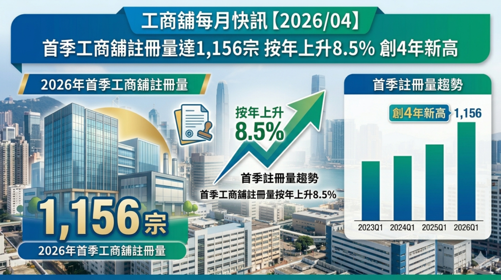總結今年首季,整體工商舖註冊量為1,156宗,按年上升 8.5%,是4年以來的新高。租售價方面,今年首季乙廈售價累升2.6%,表現較佳,但甲廈及工廈售價卻分別累跌2.7%及2.0%,反映工商舖價格的跌勢仍未扭轉。