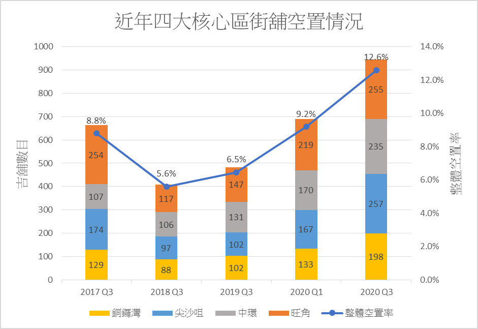美聯工商舖資料研究部分析員陳浩璋表示,受到疫情影響,四核心區空置率激增至945間吉舖,空置率的12.6%創下本行有紀錄以來新高,較今年1至2月份的689間吉舖激增37%,而按年更大增96%,其中,銅鑼灣空置率最新高見18%,冠絕各區。